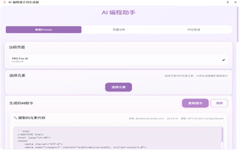 AI 编程提示词生成器 är ett kraftfullt verktyg för webbläsaren Chrome som erbjuder tre huvudfunktioner för programmerare och utvecklare. För det första, den intelligenta prompt-funktionen gör det möjligt att välja olika element på en webbsida och generera exakta programmeringsinstruktioner baserat på dessa element. Den samlar information som HTML, textinnehåll, stilberäkningar och elementattribut. För det andra, sidanalysfunktionen automatiskt extraherar HTML, CSS och typsnittsinformation från sidan, vilket kan spara tid och ansträngning för utvecklare.